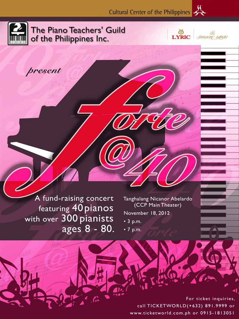 2012 is a very important year for the PTGP as it marks our 40th anniversary. In behalf of the executive board, I would like to congratulate you for having contributed to the longevity of our organization. In recognition of this milestone, we have prepared a lot of activities to celebrate 40 years of upholding our mission to raise teaching and performance standards to further the musical development and pianistic growth of our students.