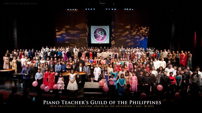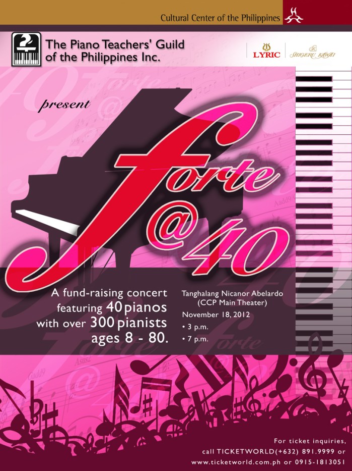We will continue with the rest of the year with appearances on various TV and Cable shows, a Seminar Series spread throughout the year and, a solo concert of US-based PTGP Alumnus, Ross Salvosa. The centerpiece of the PTGP Ruby Jubilee is a grand concert in partnership with LYRIC Pianos and CCP. This auspicious moment, a first in Philippine music history, will take place on 18 November at the Tanghalang Nicanor Abelardo of CCP where 40 (10 grand and 30 upright)pianos will be set-up on stage and as many as 80 pianists will play together.