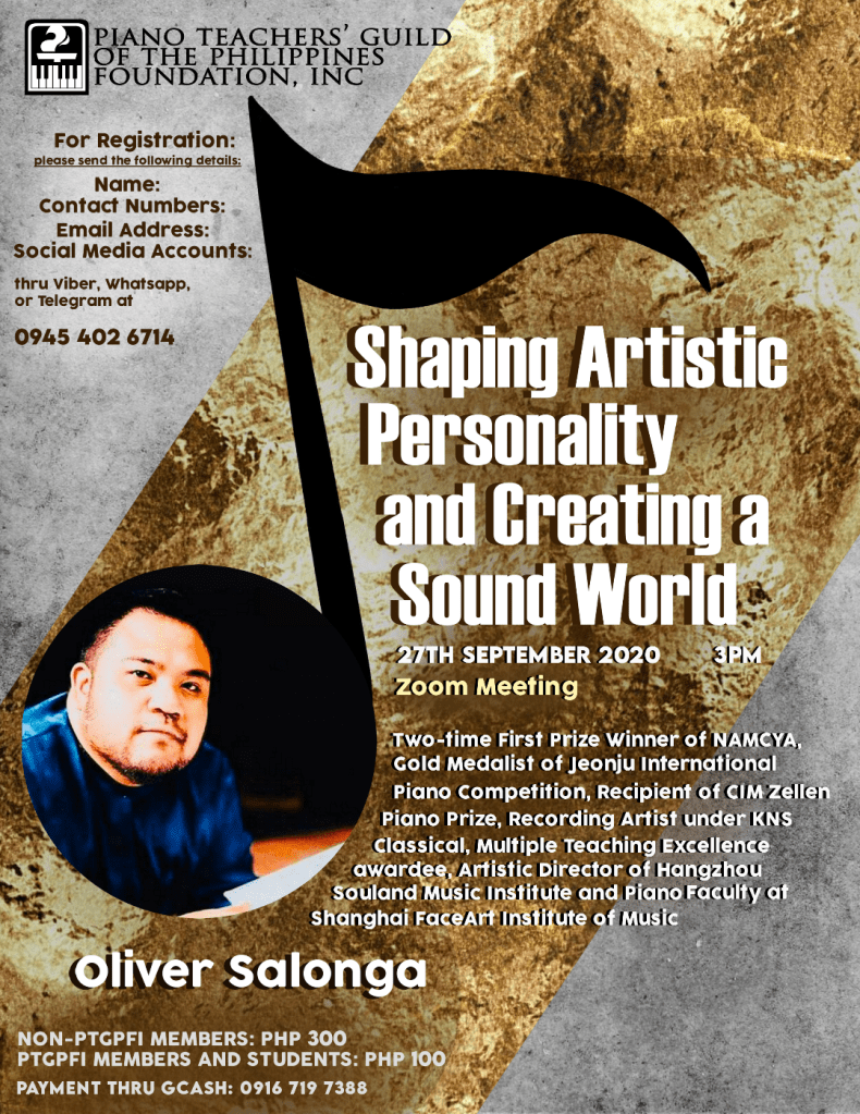 There will be a online seminar on 27 September 2020 at 3 PM, by Dr. Oliver Salonga entitled “Shaping Artistic Personality and Creating a Sound World”.